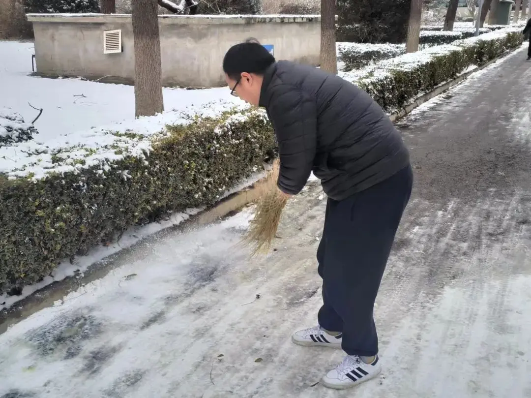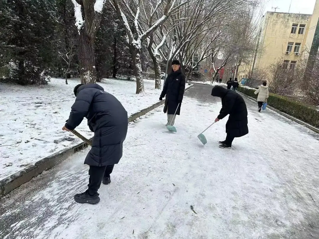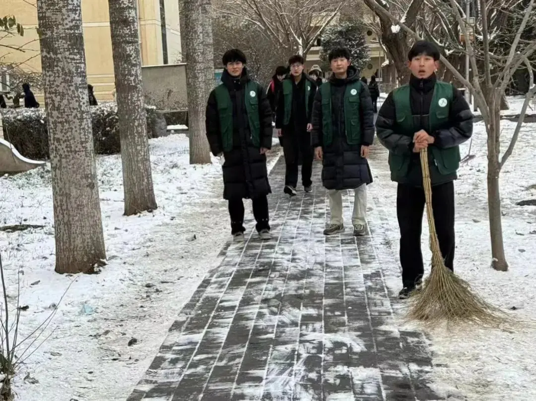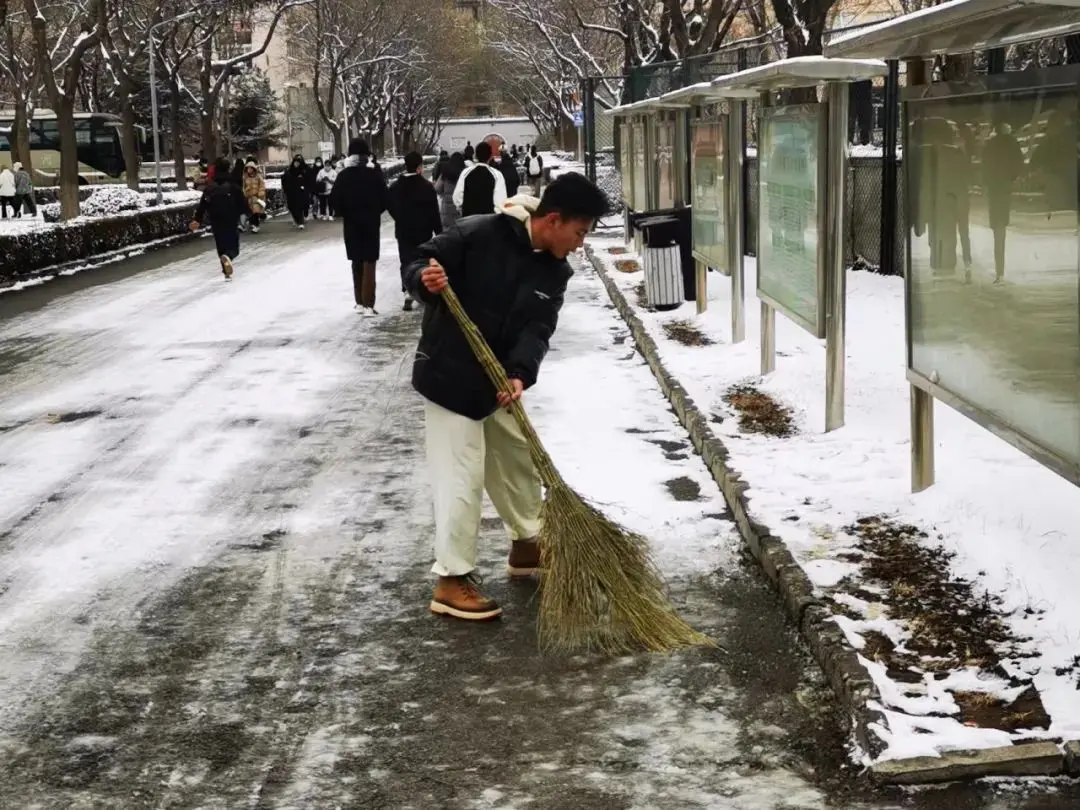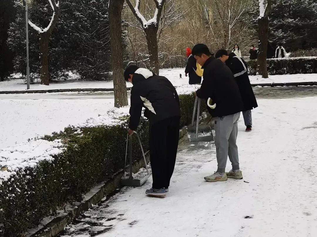 尽管雪沫夹带寒风吹着脸,但他们仍然干劲十足、热情高涨。志愿者们在老师的带领下,手持铁锹等工具进行铲雪、搬运、清扫工作,他们分工明确、默契配合,忙碌的身影在飘雪的冬日寒风中构成了一道亮丽的风景线。在大家的共同努力下,路面积雪很快铲除,清理出了行人通道,为广大师生提供了通行便利以及出行的安全保障。