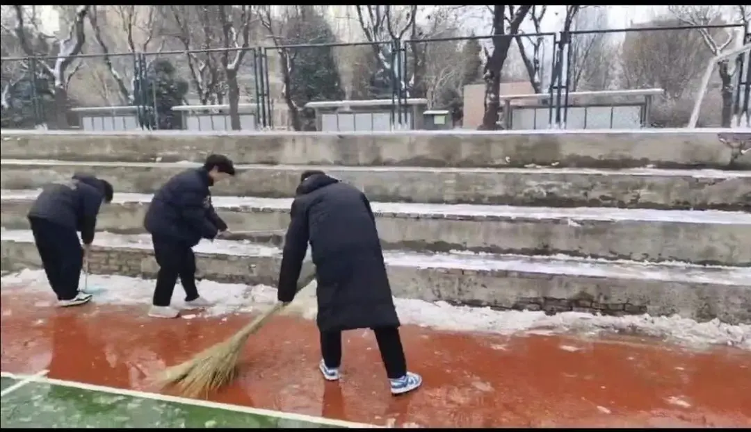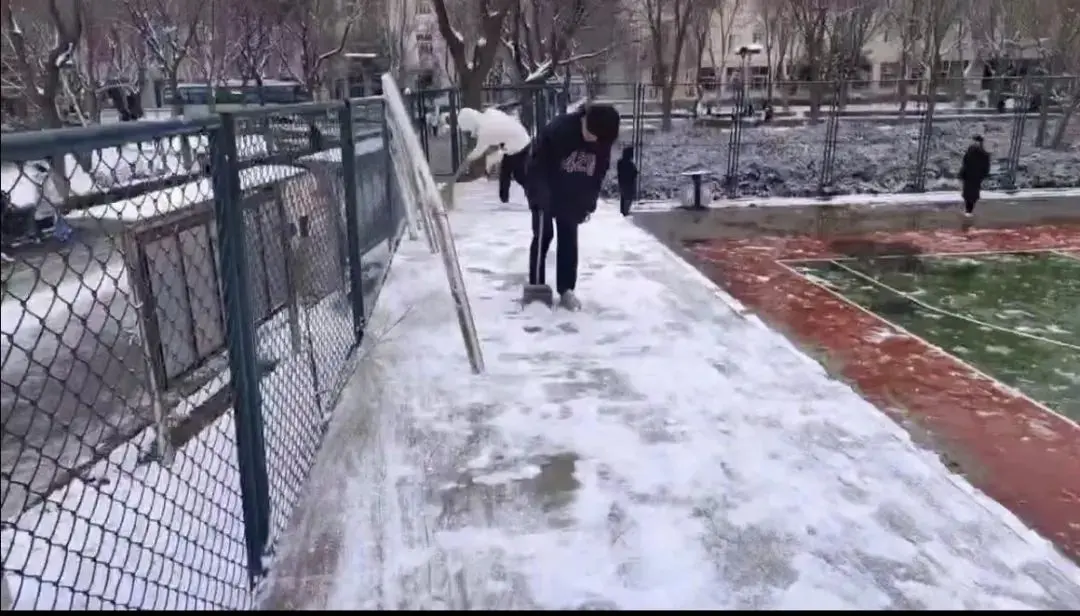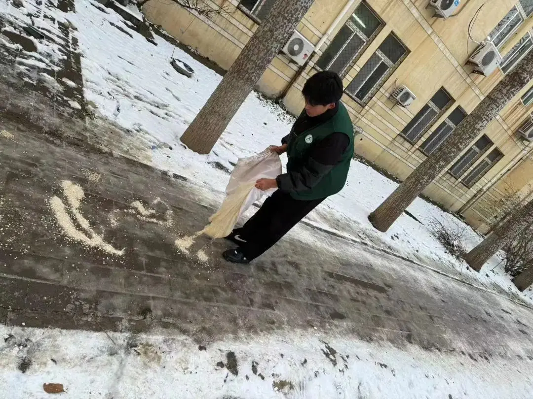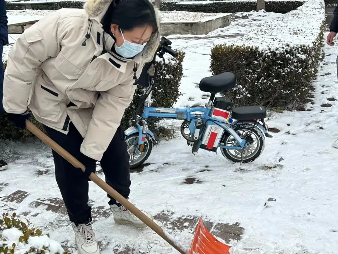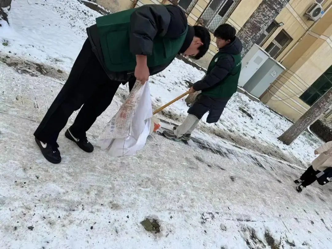 尽管雪沫夹带寒风吹着脸,但他们仍然干劲十足、热情高涨。志愿者们在老师的带领下,手持铁锹等工具进行铲雪、搬运、清扫工作,他们分工明确、默契配合,忙碌的身影在飘雪的冬日寒风中构成了一道亮丽的风景线。在大家的共同努力下,路面积雪很快铲除,清理出了行人通道,为广大师生提供了通行便利以及出行的安全保障。