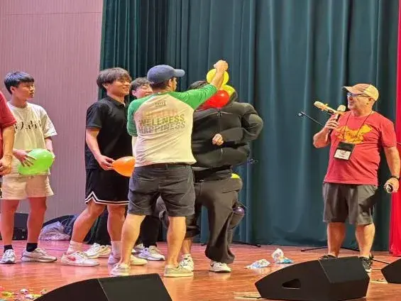 欢乐升级!同学们身上塞满气球的样子十分滑稽,他们或走或跑,气球随着他们的动作而晃动,不时发出“砰砰”的声响。这一幕幕画面,让现场观众捧腹大笑。