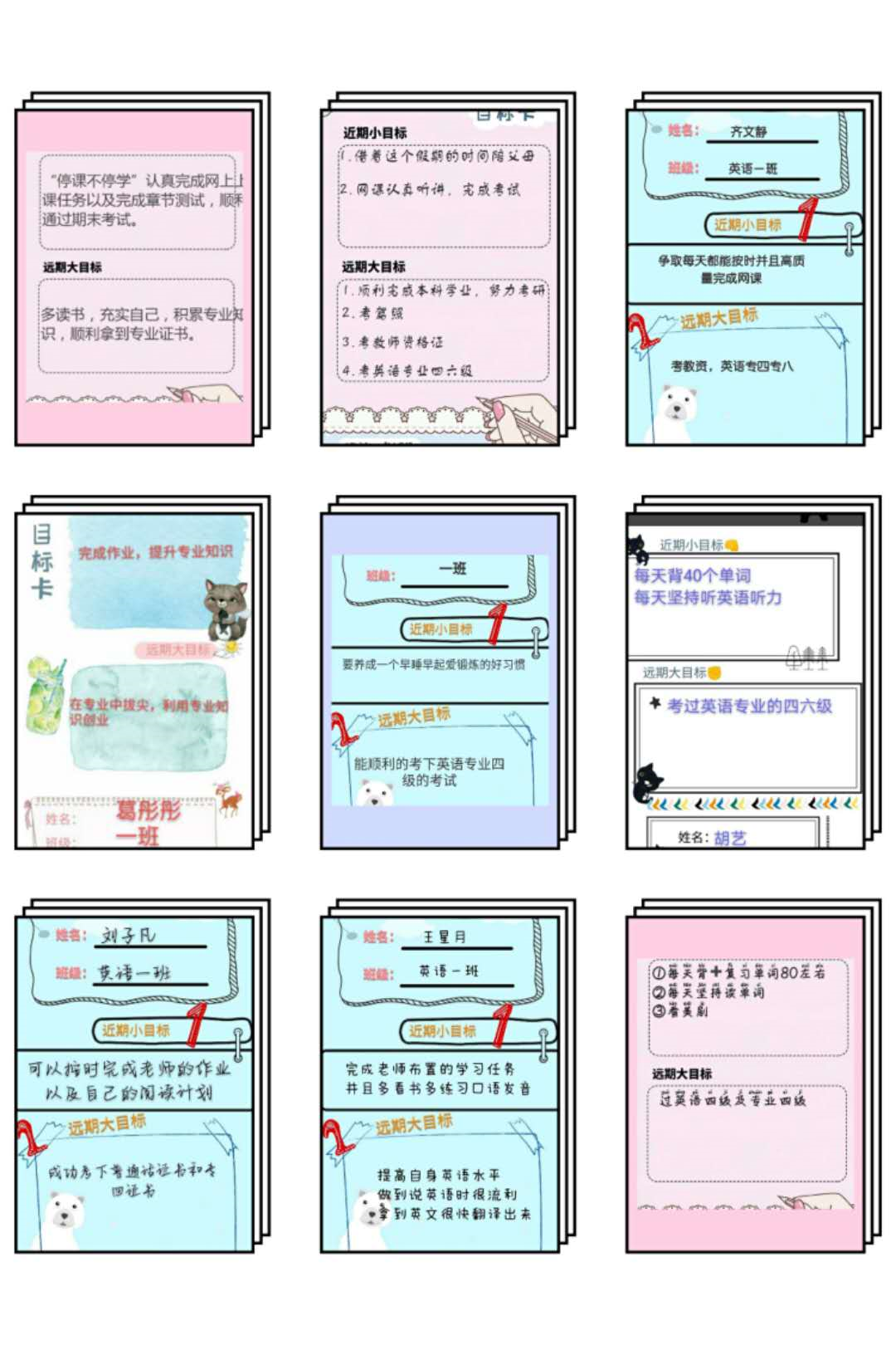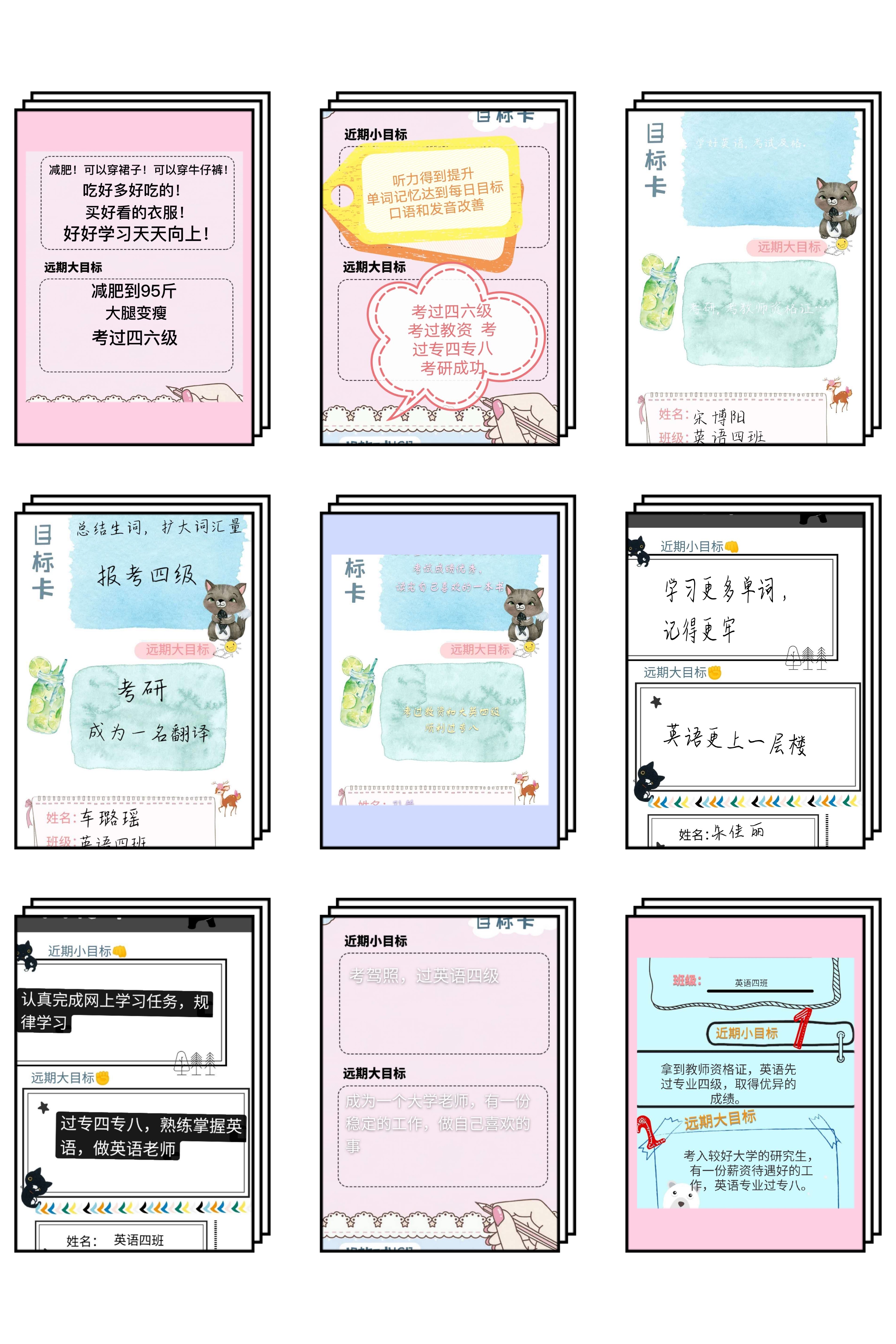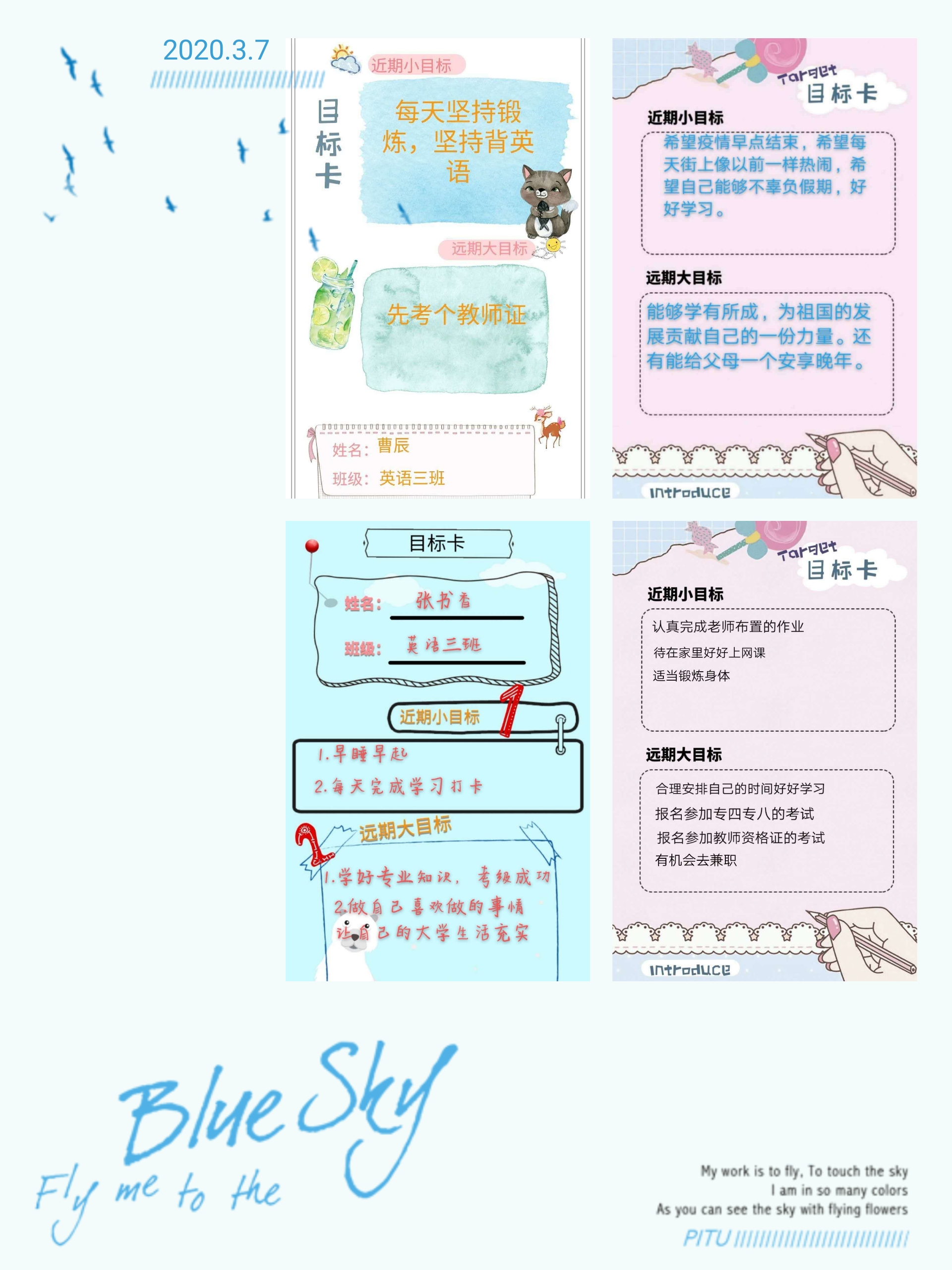 4、做好学习规划赢未来。各分团委学生填写目标卡,督促广大青年学生对自己之前的学习、生活做全面梳理,为之后的学习做好合理规划,树立各个阶段的目标。各班将目标拼成不同形式图片的形式交给李艳军同学存档。