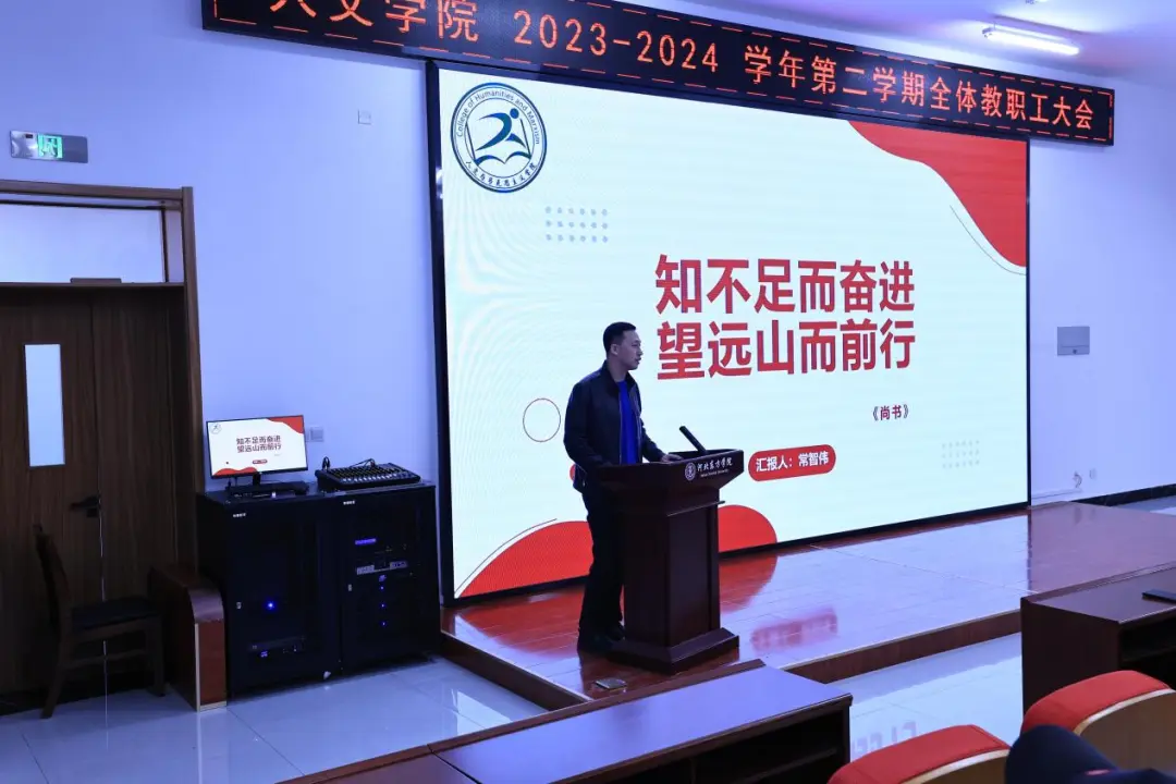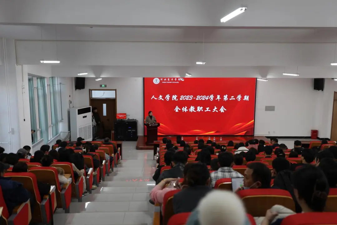 为推动学院新学期各项工作有序进行,增强教职工队伍的凝聚力,促进学院高质量发展,加快评估建设步伐,2024年3月8日我院在文华楼220报告厅召开2023-2024学年第二学期全体教职工大会。会议由谢敏书记主持,常智伟院长及人文学院全体教职工参加会议。