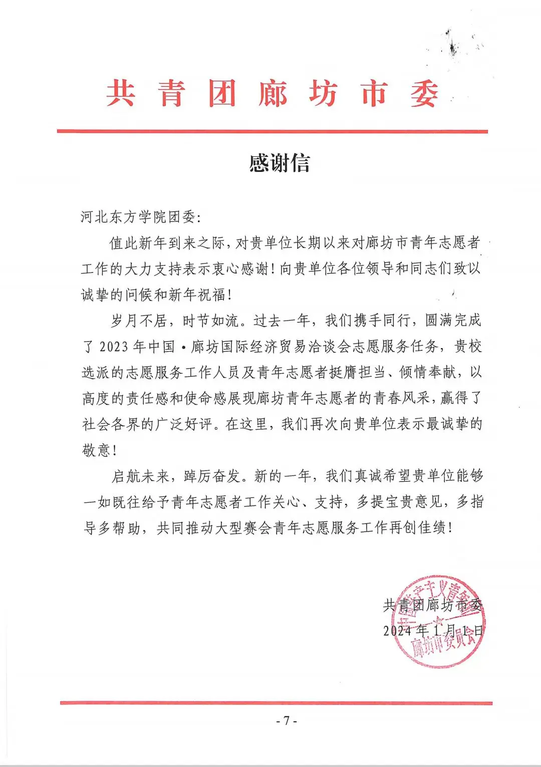 2023年中国·廊坊国际经济贸易洽谈会于6月16日至21日在廊坊临空国际会展中心举行。 的志愿者以良好的精神风貌与专业素养展示了青年志愿者的青春担当与时代风采,圆满完成志愿服务工作,成为廊洽会一道亮丽的风景线。1月1日,共青团廊坊市委发来一封感谢信,对我校选派志愿服务工作人员及青年志愿者的挺膺担当、倾情奉献表示感谢。