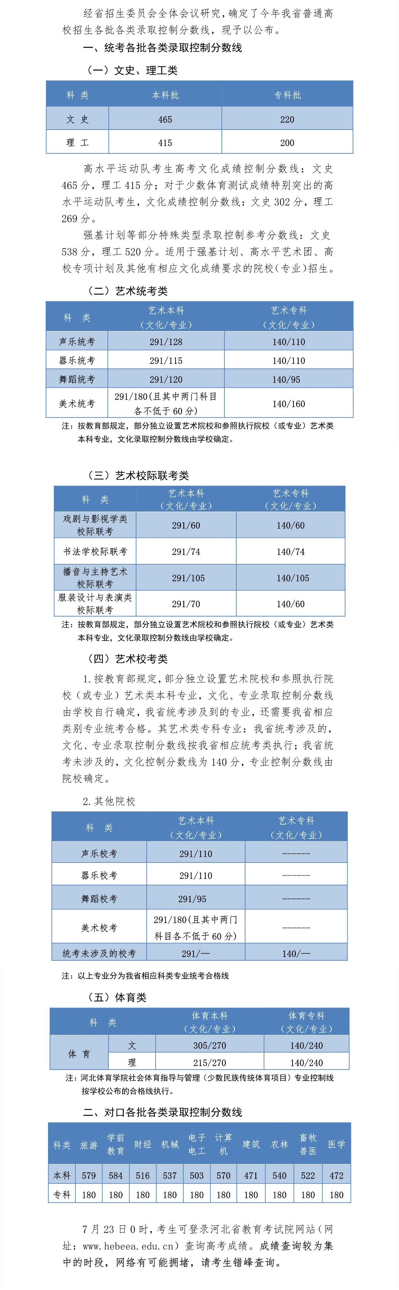 发布:2020年河北省普通高校招生各批各类录取控制分数线