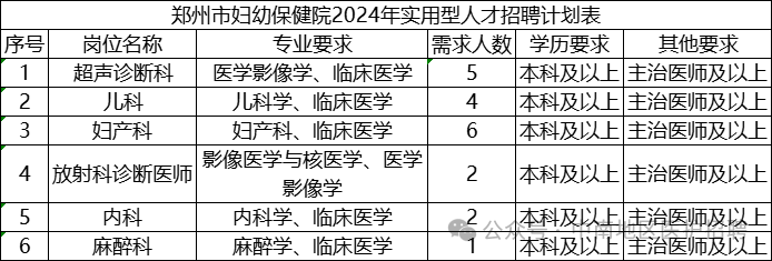 具体招聘计划见附件1:郑州市妇幼保健院2024年实用型人才招聘计划表。